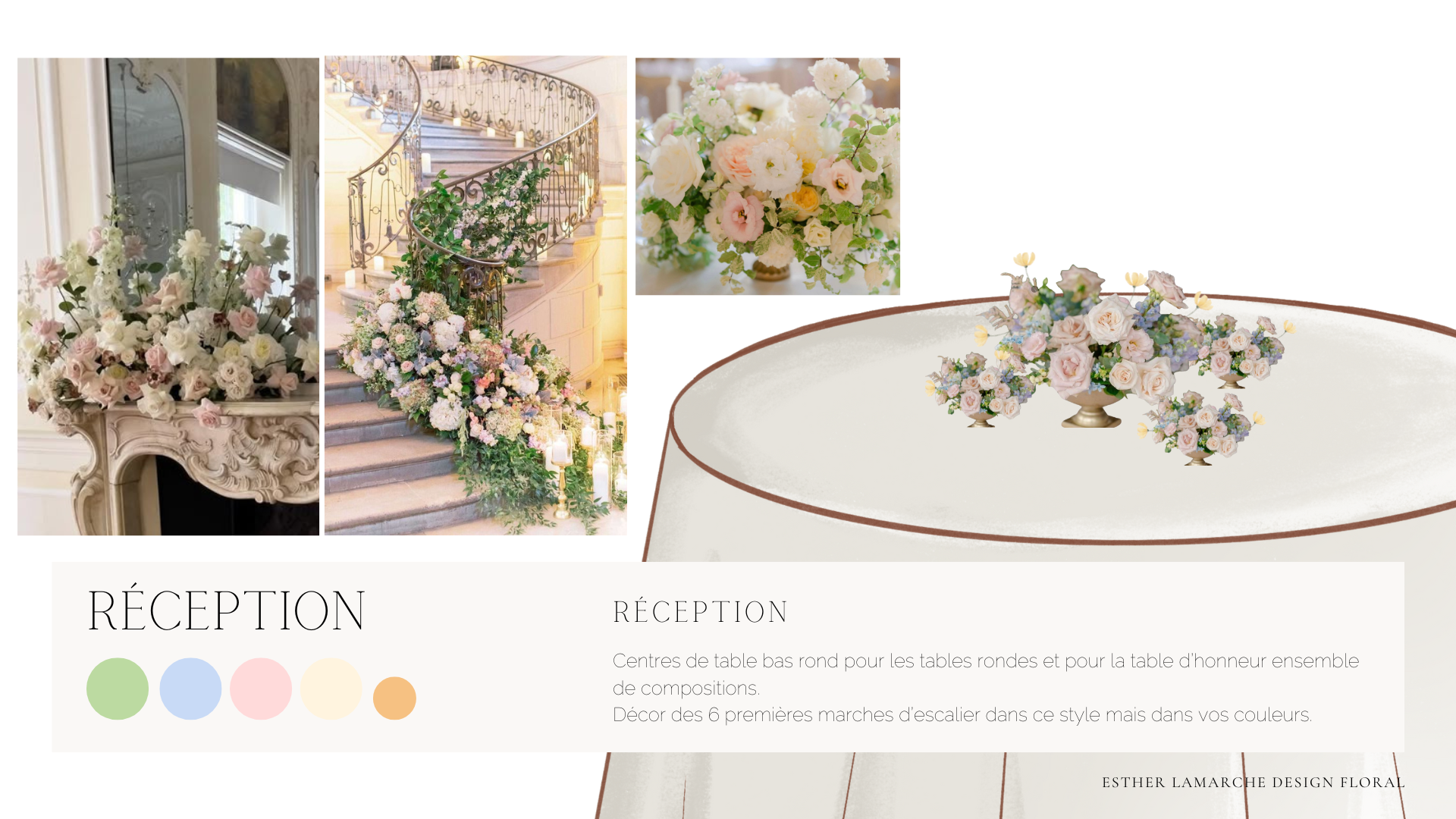 - 9h/17h (horaire à confirmer selon la logistique de l'évènement) : Installation du décor floral de l'évènement.